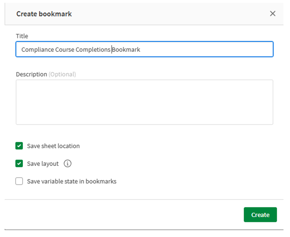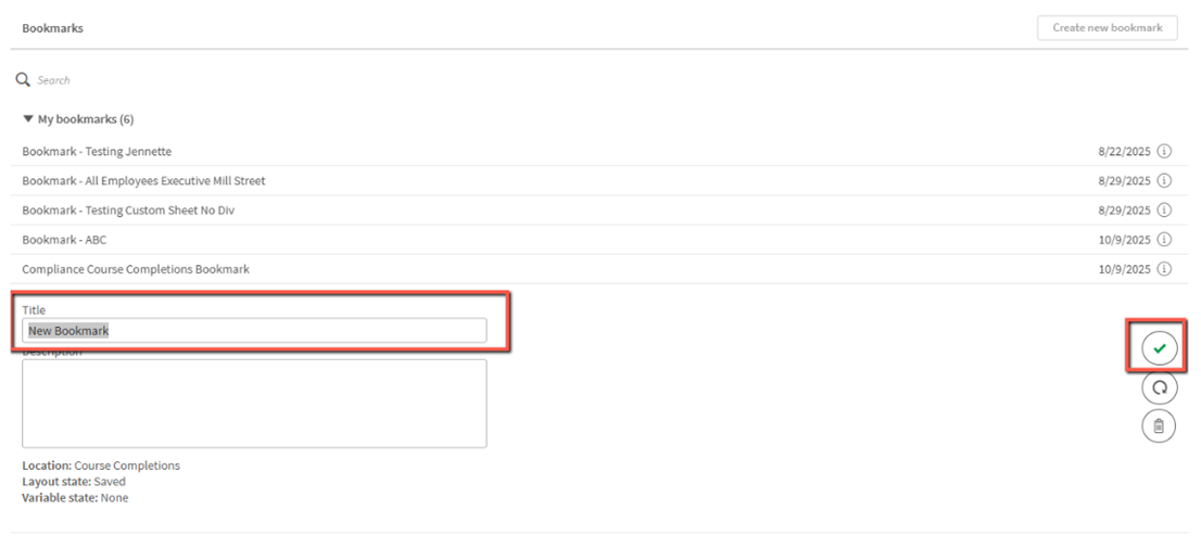 - The Bookmarks screen will reopen, allowing you to name your new bookmark. Enter the Title and Description, if needed, and then click the check mark to accept and create.