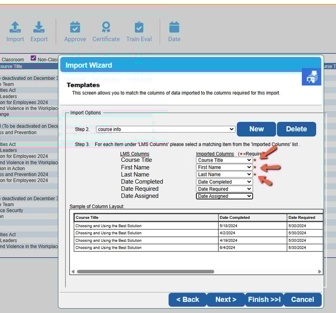 - Select the data sets from your spreadsheet to match the LMS Columns. The columns with asterisks are required and the others are recommended.
